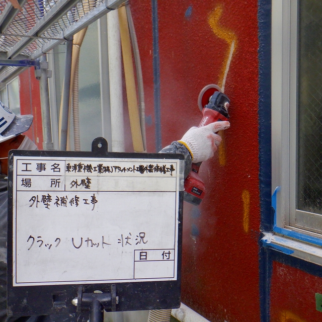 外壁のひび割れを補修します。クラックに沿ってサンダーでVカットします。