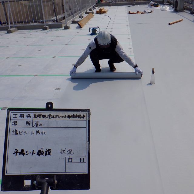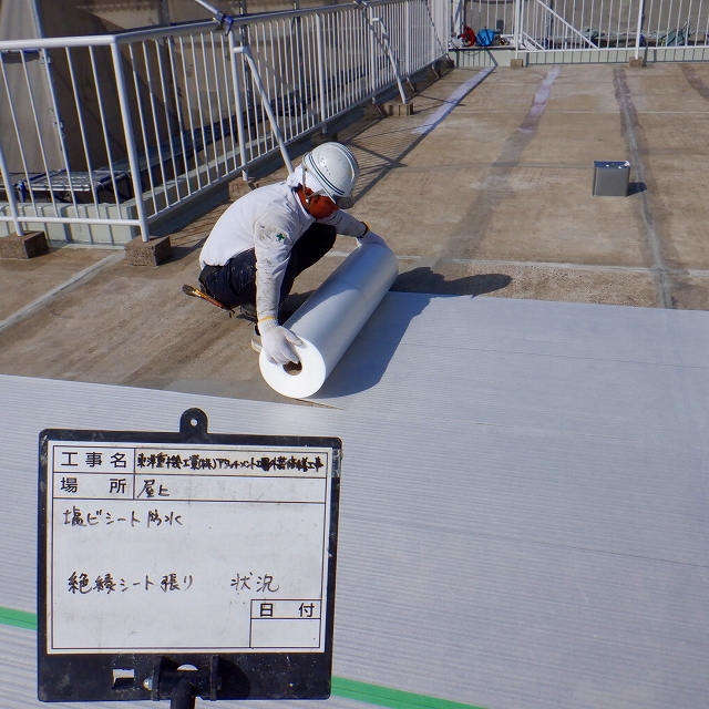 通気緩衝工法工事なので、既存のシートの上に絶縁シートを敷きます。