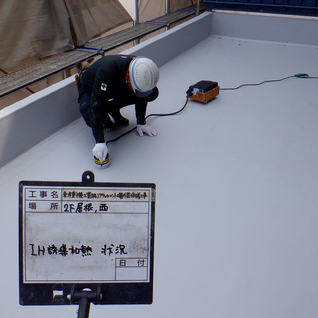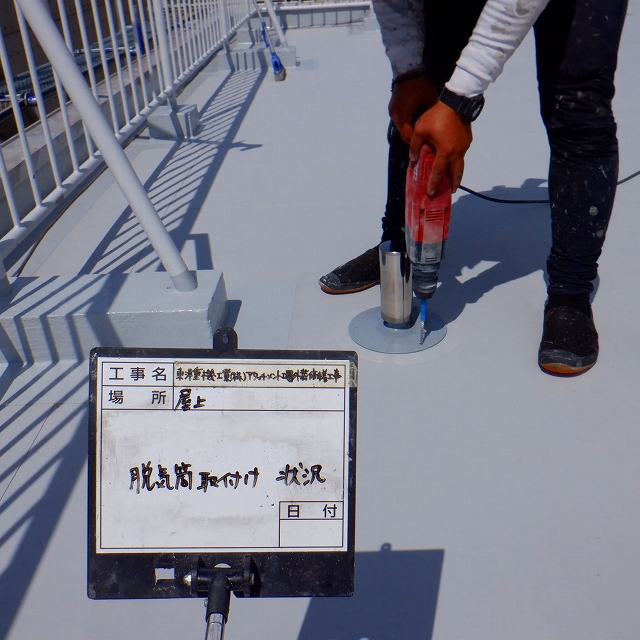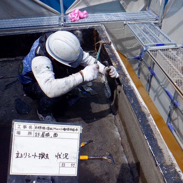 立ち上がりのシートを除去しています。平場は通気緩衝工法ですが、立ち上がり部分は密着工法で施工します。