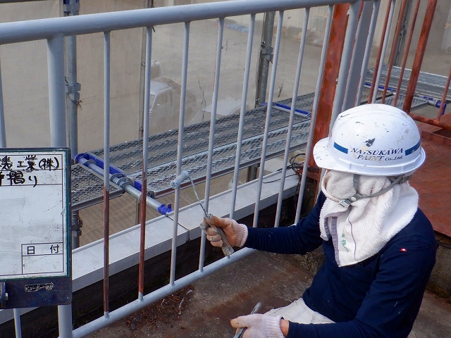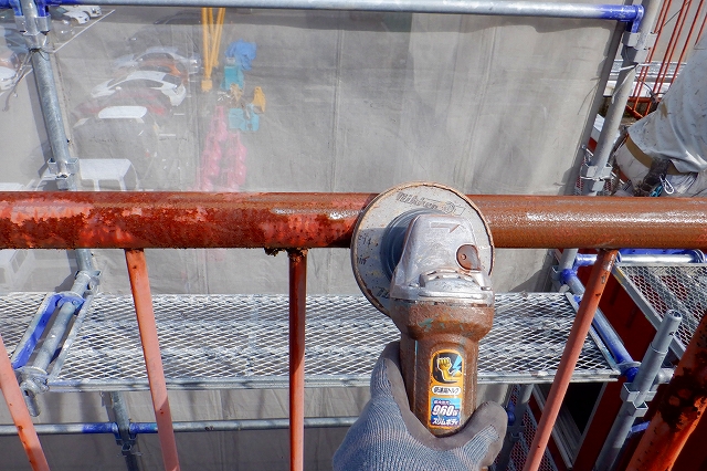 手摺のサビを取っていきます。サンダーを使って除去しています。